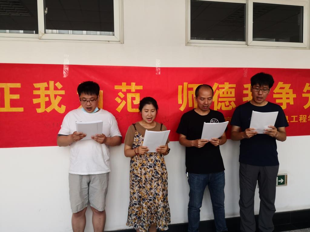 誓言有声,育人无形。为更好地督促和加强信息工程学院教师的师德师风建设,强化学习贯彻《教师师德手册》,引导教师牢固树立教书育人、为人师表的良好形象,信息工程学院组织开展了“身正我为范 师德我争先”主题教育活动。