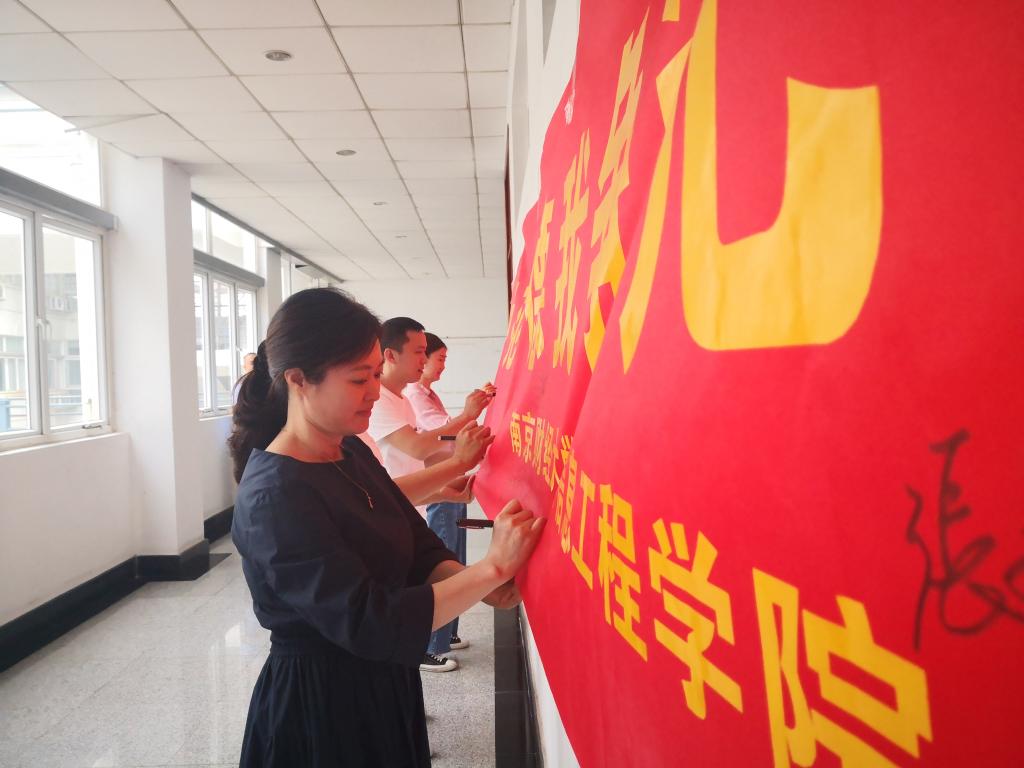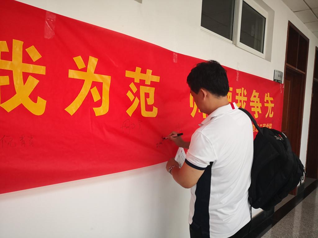 身正为范,师德争先。6月1日上午,信息工程学院老师们纷纷在横幅上签上自己的名字,写下自己的承诺。新进学院的青年教职工还举行了 “身正我为范,师德我争先”宣誓承诺活动,教师们手捧《师德手册》,齐声宣读《入职誓词》,立志以德立身、以德立学、以德施教,争做四有好老师。阵阵激昂的誓词回荡在整个德业楼,直击心灵。