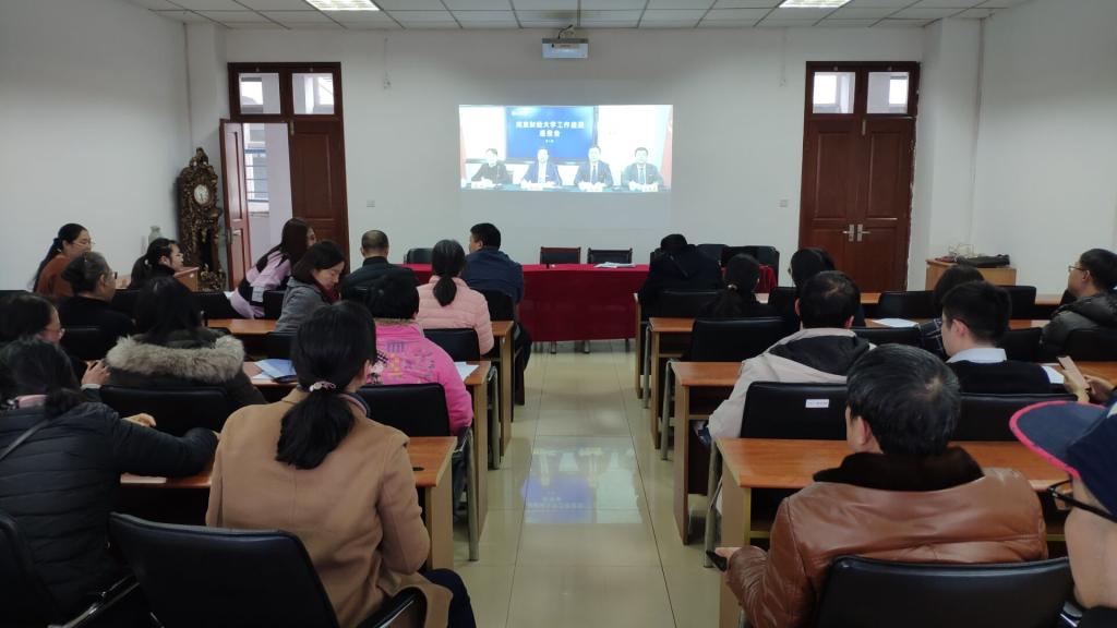 在德业楼406组织观看学习学校第一期工作进展通报会,全体教职工参加会议。会议由院党委副书记袁军主持。