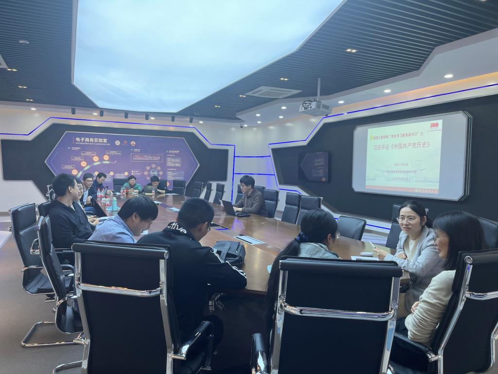 下午学院下属各党支部分别在相应的会议室、教室进行集中学习、研讨。各支部均安排相关党员同志进行领学,随后各支部就当日学习内容展开热烈研讨,电子商务实验室党支部蒋伟伟说:“今天的学习系统回顾了我们党团结带领中国人民不懈奋斗的光辉历程,深入总结党在各个历史时期创造的理论成果、积累的宝贵经验、铸造的伟大精神,让我收获匪浅,今后我们将沿着党的光辉历程继续前进,以优异成绩迎接党的100周年。”研究生党支部丁达同学分享了他对于党史学习的感悟:“看了领学同学介绍的西柏坡革命故事,我深刻的明白当时的共产党处境有多么的艰难,今天中国的成就来之不易,没有共产党就没有现在的中国!”