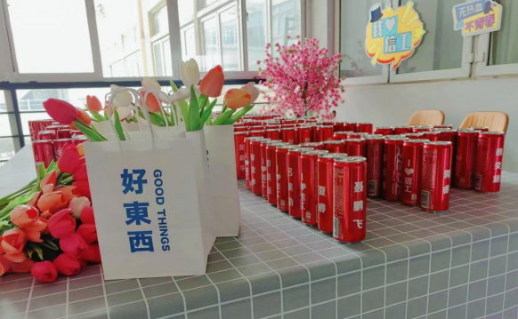 图为学院印制的含有新生姓名和“我爱信工”字样的定制可乐、郁金香花