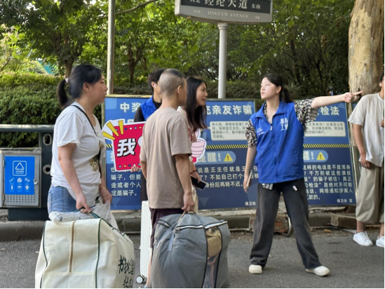 图为学院迎新志愿者正在宿舍区开展迎新志愿服务工作