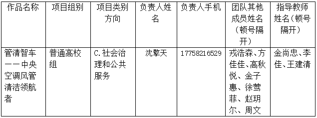 南京财经大学信息工程学院(软件工程2001)班学生周文,学号:21020203042,作为项目成员跨校参加由中国计量大学作为申报单位的浙江省第十四届“挑战杯”大学生创业计划竞赛,参赛项目名称《管清智车——中央空调风管清洁领航者》,具体信息见下表。