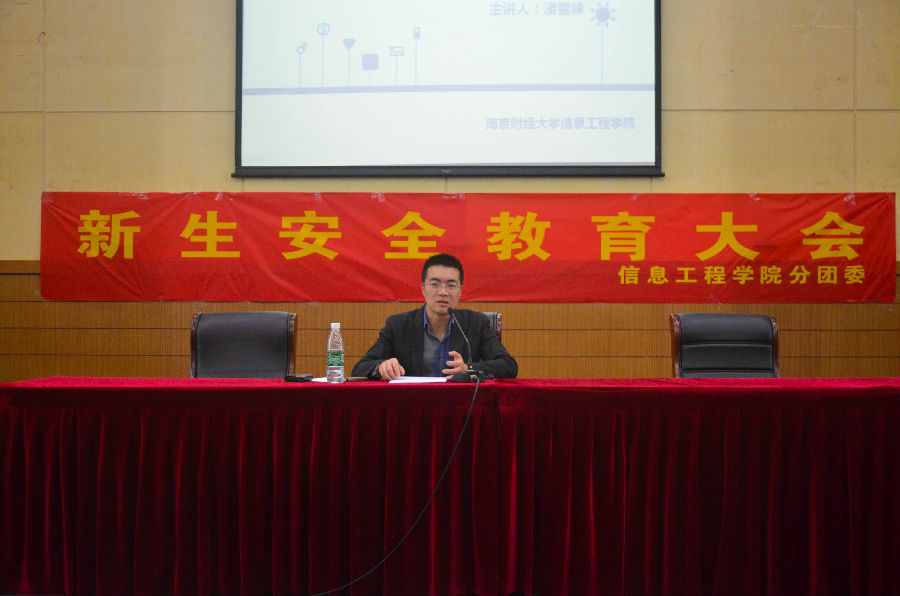 2015年10月13日晚上,信息工程学院在仙林校区管理学科楼报告厅为2015级新生举办安全教育知识讲座,由院党委副书记潘雪峰老师主讲。