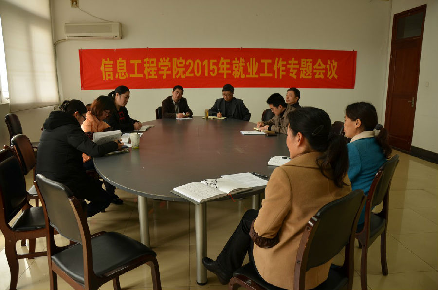 2015年4月15日上午,信息工程学院在理工学科楼428召开了2015年就业工作专题会议。本次会议由党委副书记潘雪峰主持,参加会议的有党委书记韩忠愿,院长曹杰,副院长许建平、宣恒农、科研秘书田世红及全体学工队伍老师。
