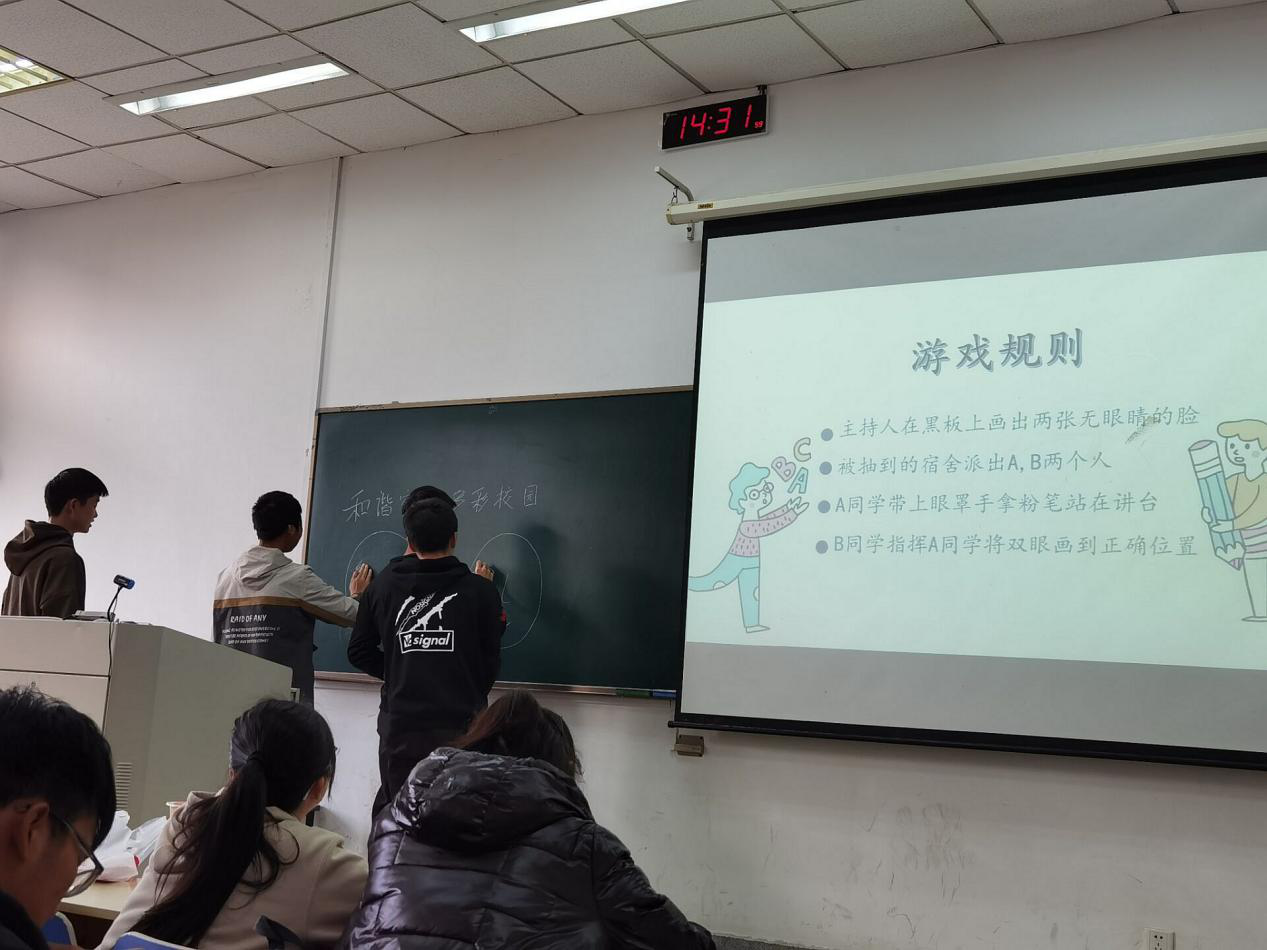 计算机2001班的主持人为心理委员董梦辰。活动流程大致分为三块:学长分享经验、室友合作游戏、寝室“友情拷问”。在主持人简单介绍后,计算机1902班心理委员夏天豪学长列举了入学时与室友相处时可能遇到的问题,并提出他的解决办法供同学们参考,同学们表示受益良多。接下来的游戏环节中,同学们都积极参与其中,现场氛围逐渐高涨。由宿舍对决游戏到男女相争环节,互有胜负。游戏结束后,大家都意犹未尽。最后的问答环节,同学们坦诚相待,讲述对室友的初次印象以及后来的改观,室友间的感情得到进一步加深。