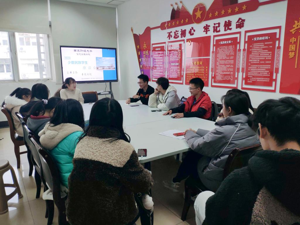 在德业楼4楼党支部书记办公室举行召开少数民族学生座谈会。会议由辅导员刘芳老师主持,土家族、回族、蒙古族、彝族、穿青人等少数民族学生参加了此次座谈会。