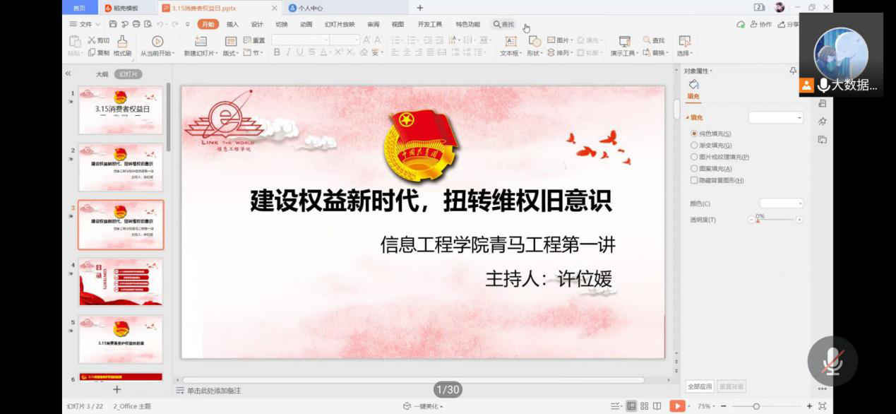 2021年3月12日,信息工程学院就即将到来的“消费者权益保护日”以“建设权益新时代,扭转维权旧意识”为主题通过腾讯会议开展了免费足球直播app