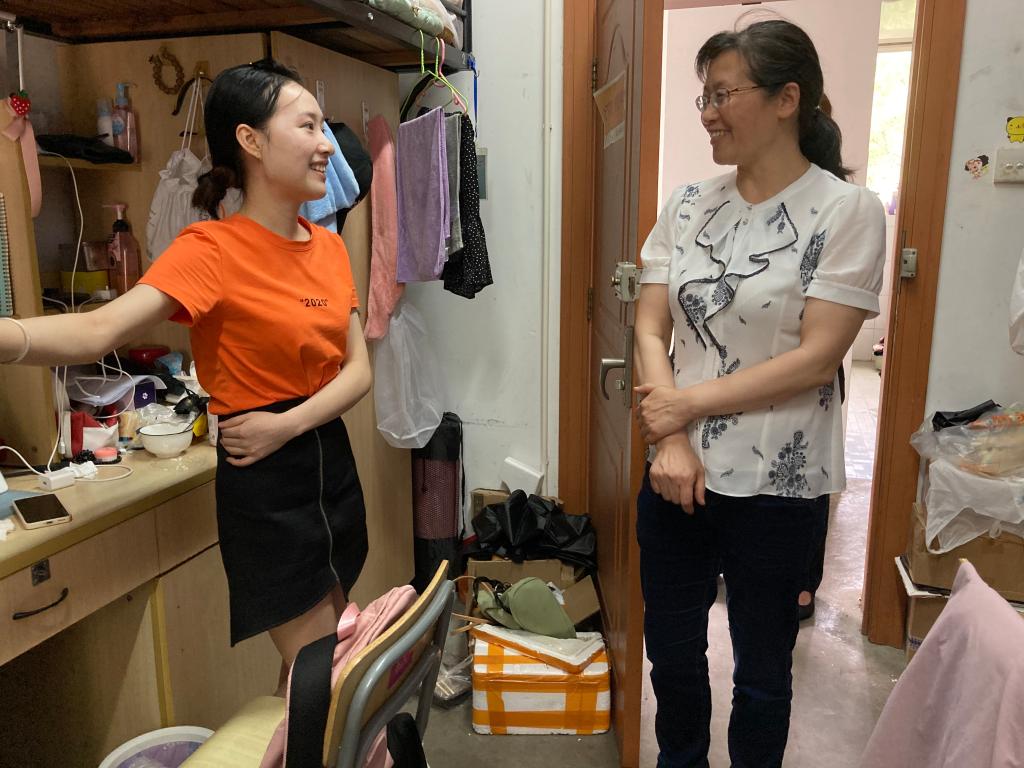 途中,学子们看到老师们都表示出欣喜与热情,积极地向老师们问好并主动上前交流。观察到学生们搬行李不易,周亚芳书记提出可以通过跳蚤市场将物品转给有需要的学弟学妹,以此来减轻离校搬运行李的压力。同时,在学生宿舍中,周书记悉心问询了学子们毕业后的去向与打算,并与实际情况进行考虑,提出了自己的建议,同辅导员一起和同学对就业想法进行了交流,得到了热情的反馈,并达成了共识。随后,老师们还看望了其他年级的学子,对他们的生活环境作了认真的考察,深入了解他们生活宿舍的整洁度与硬件设施。并对他们的考研事项、日常学习进行了关心。