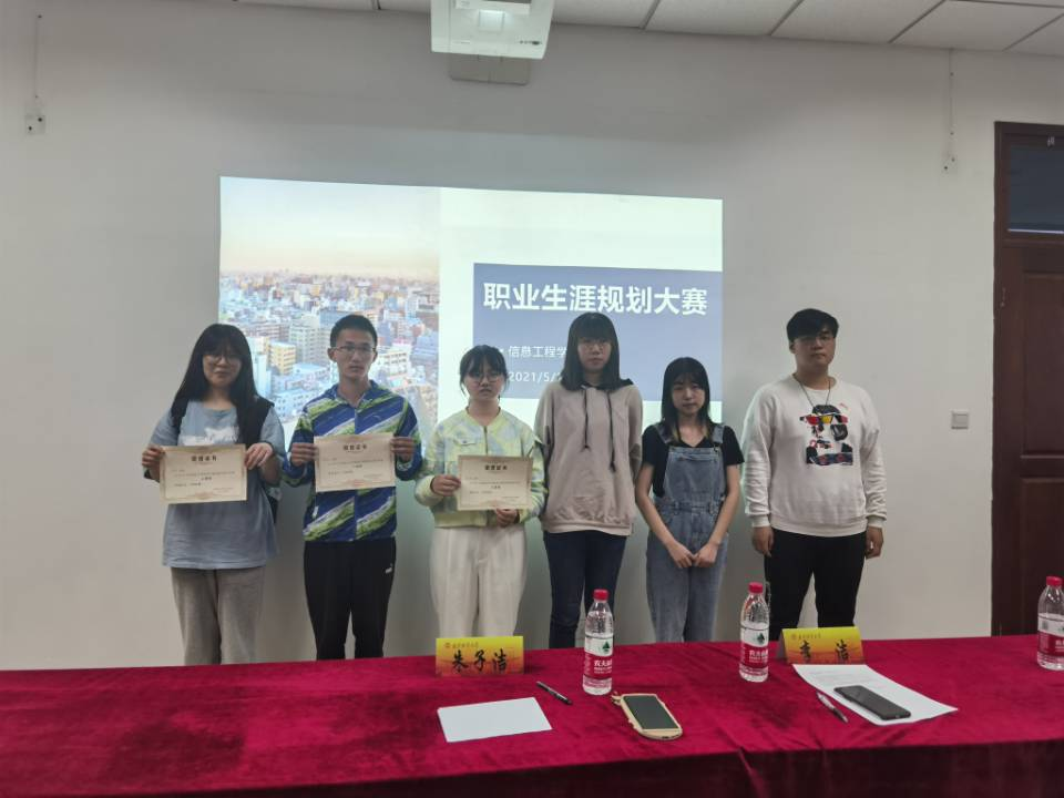 软件工程2001班周文获得一等奖,大数据2002方蕊获得二等奖,计算机2001宋心蕊获得三等奖。最后,各位评委为参赛人员颁奖并合影留念。