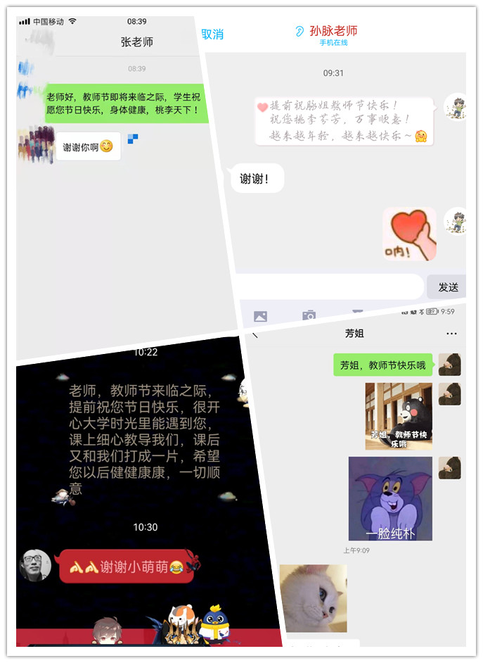 “浓浓师生情,满满都是爱”。一些同学给自己喜欢的老师写下一段祝福语,也有在这个节日里的特殊感触,在教师节发送给老师。虽然是小小的一句祝福,包含的是对老师工作的肯定以及辛勤培育的感恩!