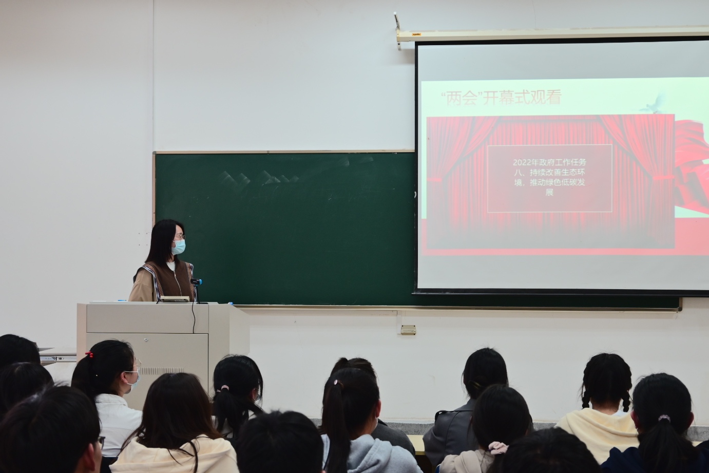 活动中,同学们研学了《政府工作报告》节选内容,观看了两会开幕式和全国人大代表陈良的发言等视频。从“为把祖国北疆万里绿色长城构筑得更加牢固继续努力”这一议题出发,同学们深入了解了我国近年来绿色生态方面的突出成就,如塞罕坝“荒原变林海”、毛乌素沙漠治沙等,建立起对我国环保成效方面较为直观的理解。
