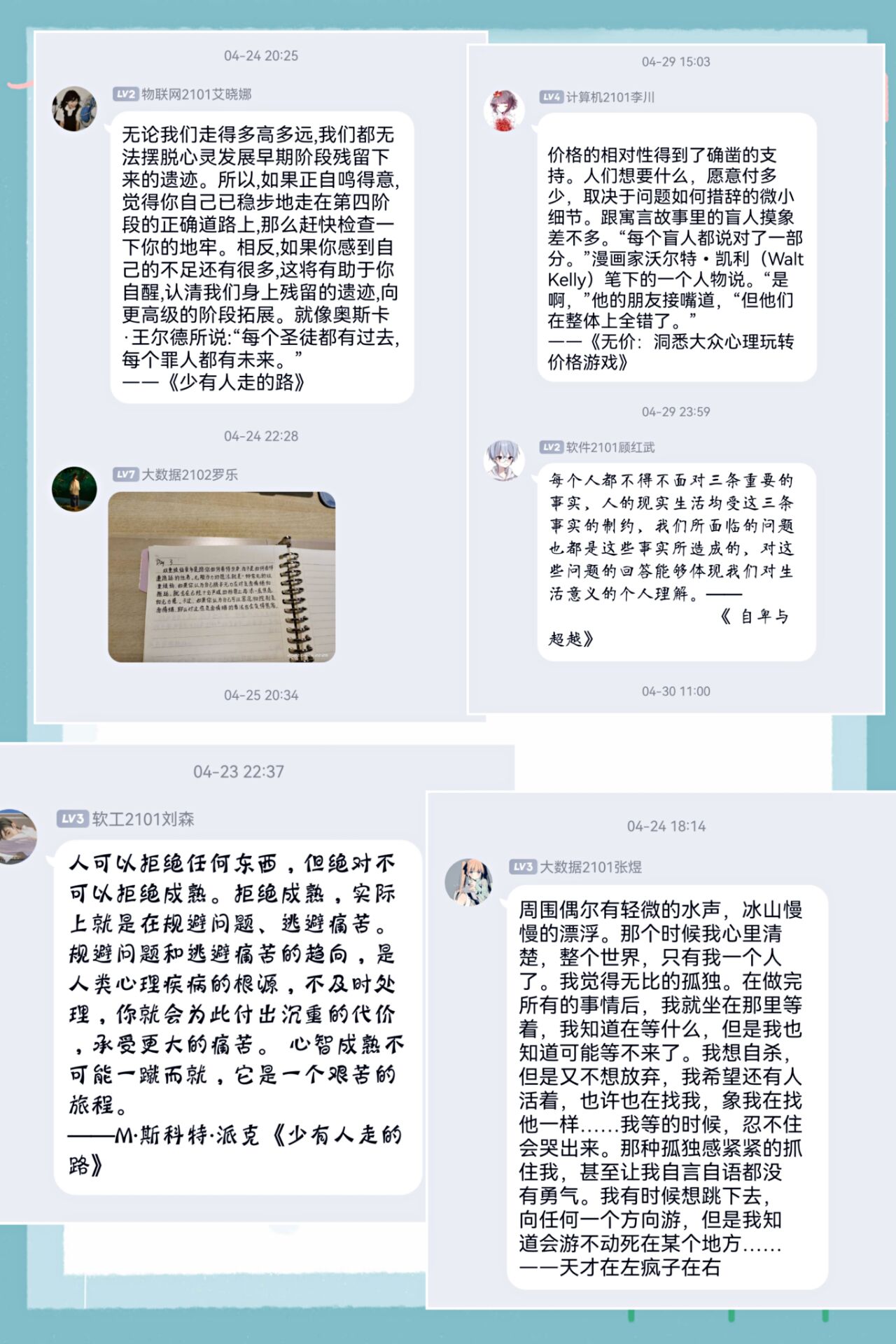 大数据2101班徐铁闻同学说:“自疫情封校以来,窝在宿舍的我感到时间忽然就变多了,但我却失去了静下来总结感悟的耐心,而读书打卡活动能让我重拾坚持长期阅读的耐心。罗曼罗兰曾说过‘和书籍生活在⼀起,永远不会叹⽓。’短短的几天打卡不是目的,关键还是培养终身学习和自我鼓励的能力,这才是读书要达到的目的。”
