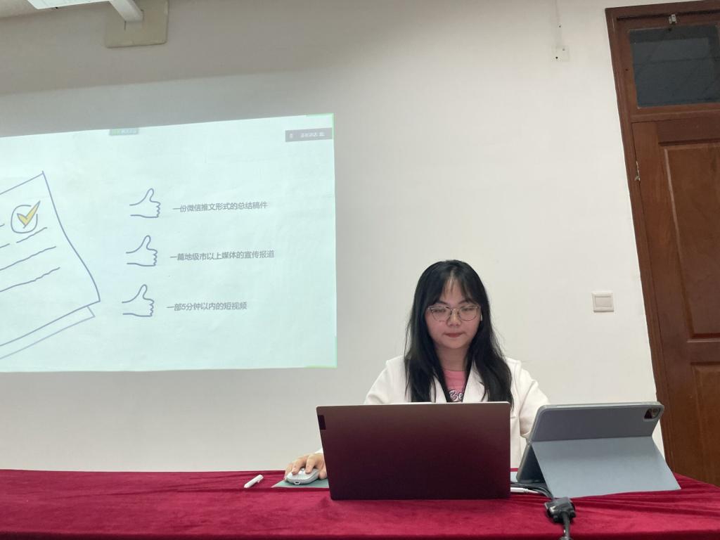 2021年暑期社会实践“优秀团队”代表宋心蕊同学还和同学们分享了团队实践经验,她结合实践经历,从如何选题、前期准备、团队分工协作、联系对接时间点、做好外宣等方面做了详细介绍。此外,她还鼓励同学们积极参与暑期社会实践、丰富实践形式,她说:“明确项目的意义,才能知晓暑期社会实践的重要性,才会督促你去认真做好实践。”