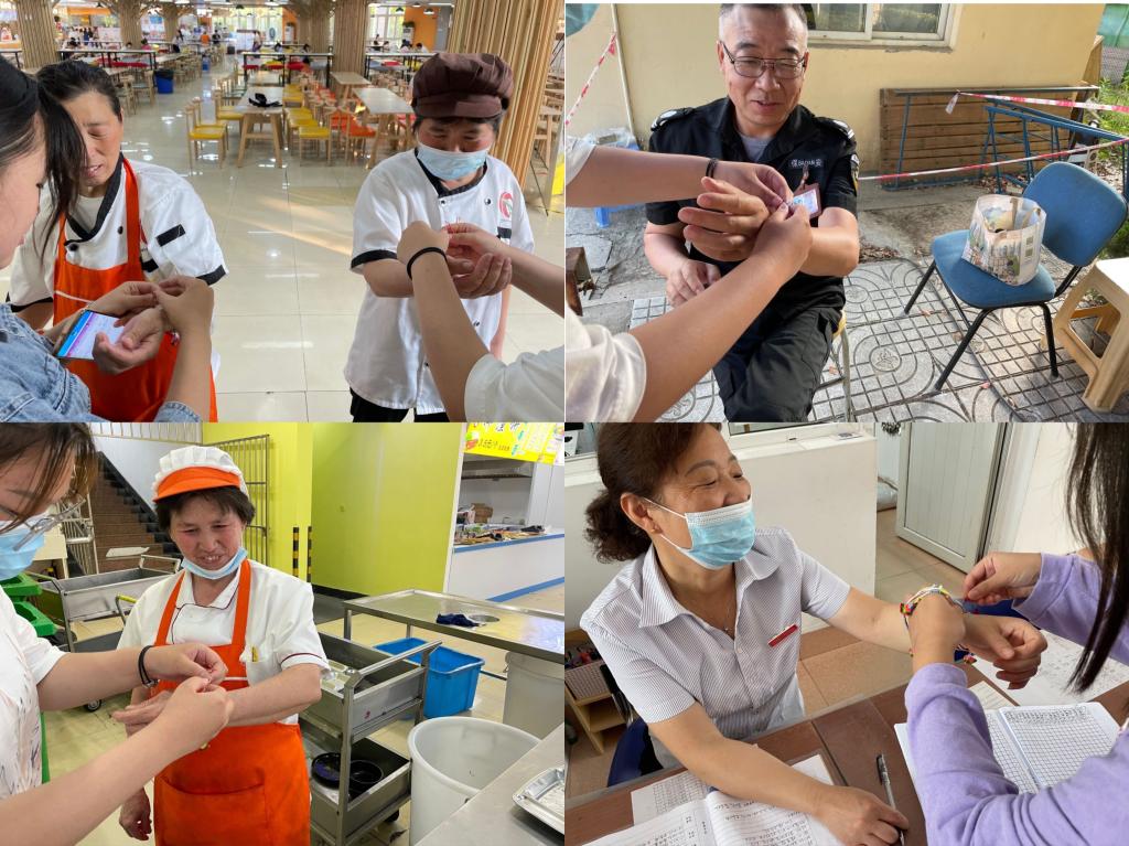 活动中,同学们了解关于非遗绳结的由来和端午习俗,并尝试自己编织五彩绳。编织完成后,同学们还纷纷将自己编织的五彩绳结送给学校后勤人员,并送上端午祝福,感谢叔叔阿姨们一直以来的悉心照顾。