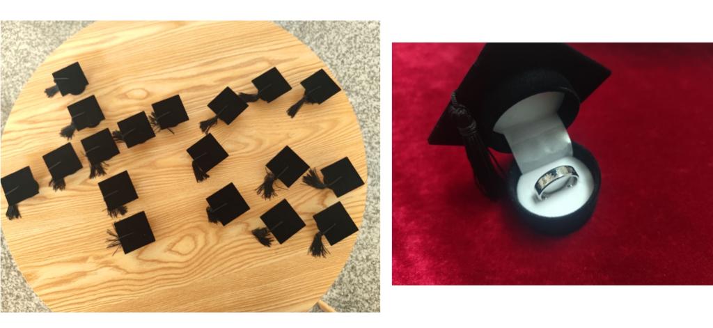 戒指,有盟誓之意。毕业戒指,是信物,是羁绊,是对南财信工院的留恋,是承载着青春岁月的信物,也是践行校训精神的承诺。小小硕士帽里的戒指外圈刻着的南京财经大学信息工程学院的字样,象征着引以为傲的南财人的身份,诉说着母校对毕业生们的殷殷期望;内圈刻着的姓名学号,打造了毕业生们的专属印记,珍藏着他们独一无二的青春回忆。用戒指代替语言,让回忆定格南财。在多年后的某一天,戴上戒指,回到南财,亦可 寻找他们的曾经。
