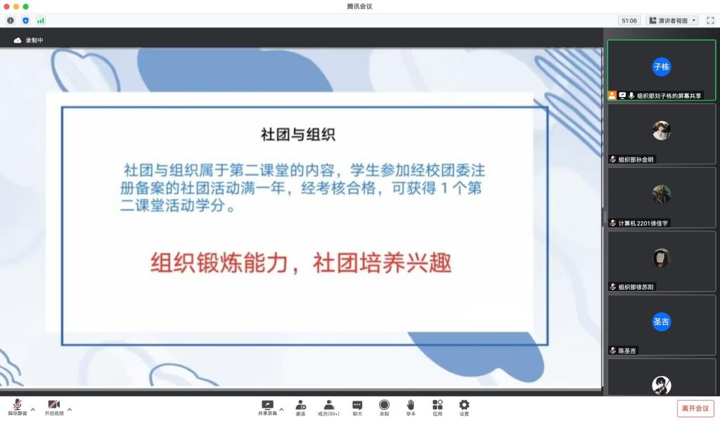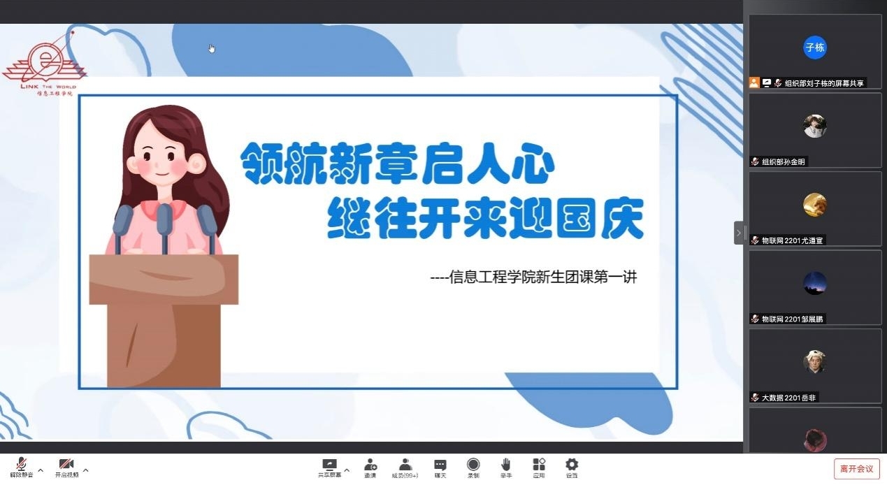 为帮助2022级新生更好地认识、融入大学,适应大学的新生活,培养新生积极向上、拼搏奋斗的精神,9月29日晚,信息工程学院分团委在线举办了“领航新章启人心,继往开来迎国庆”——新生团课第一讲,2022级全体同学参加。
