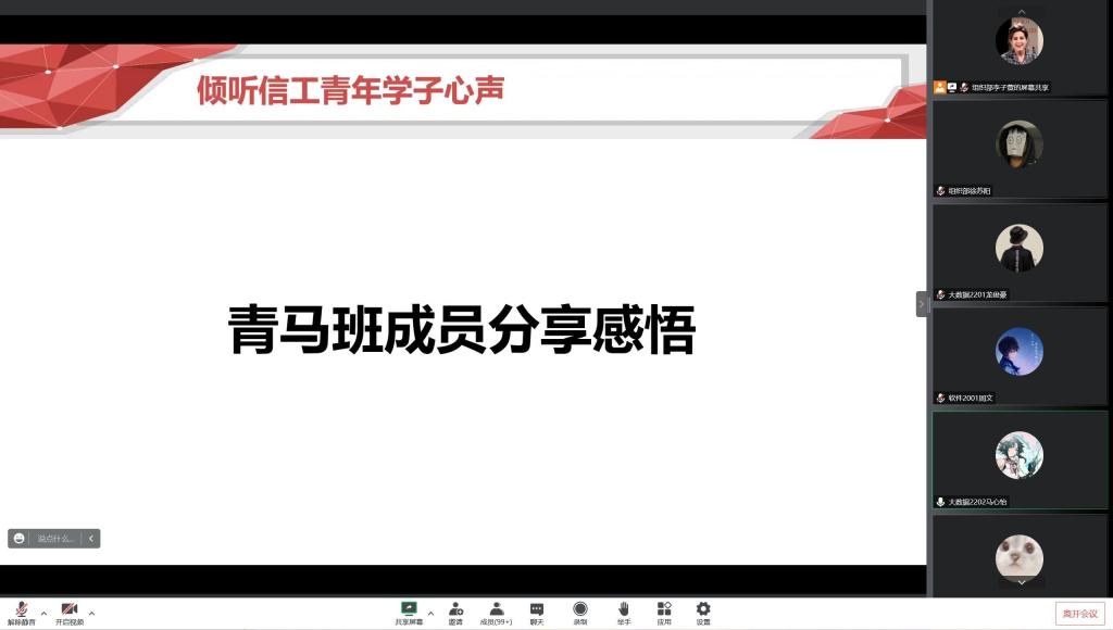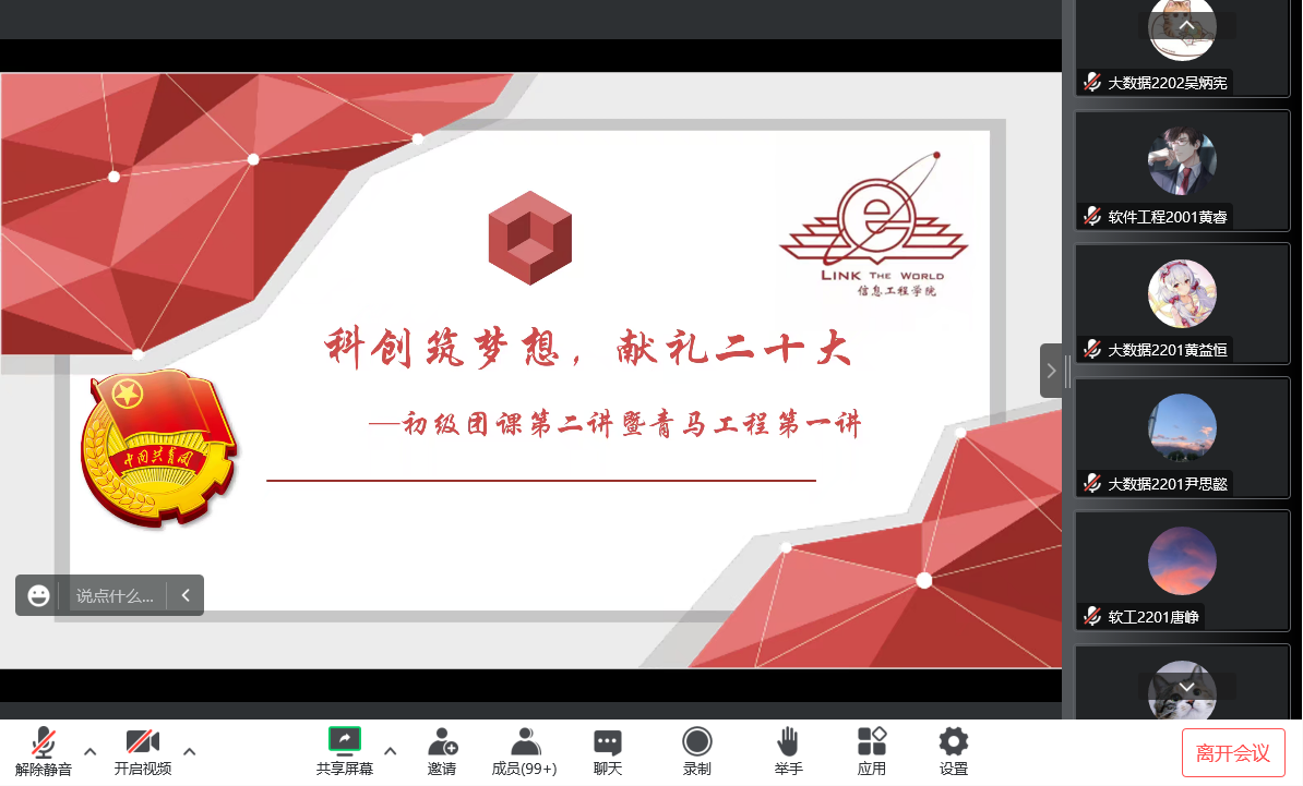 为深入学习贯彻党的二十大精神,引导同学们发扬科技创新精神,10月28日晚,信息工程学院团委在线举办了“科创筑梦想,献礼党的二十大”初级团课第二讲暨青马工程第一讲,2022级全体同学及青马班全体学员参加。