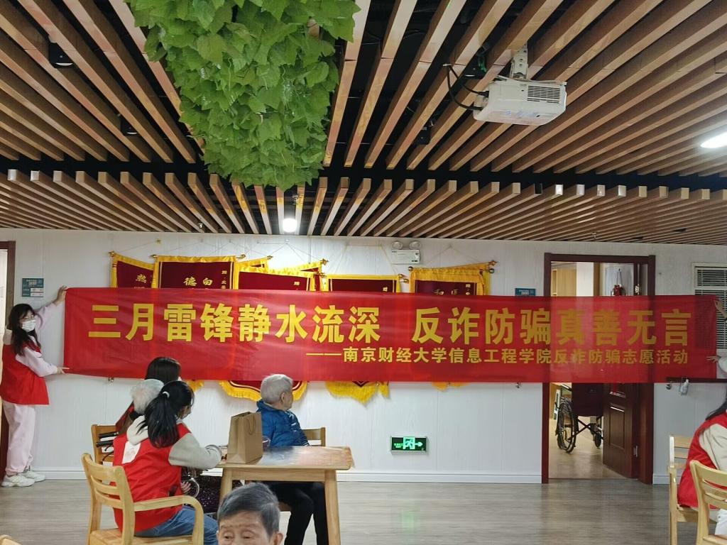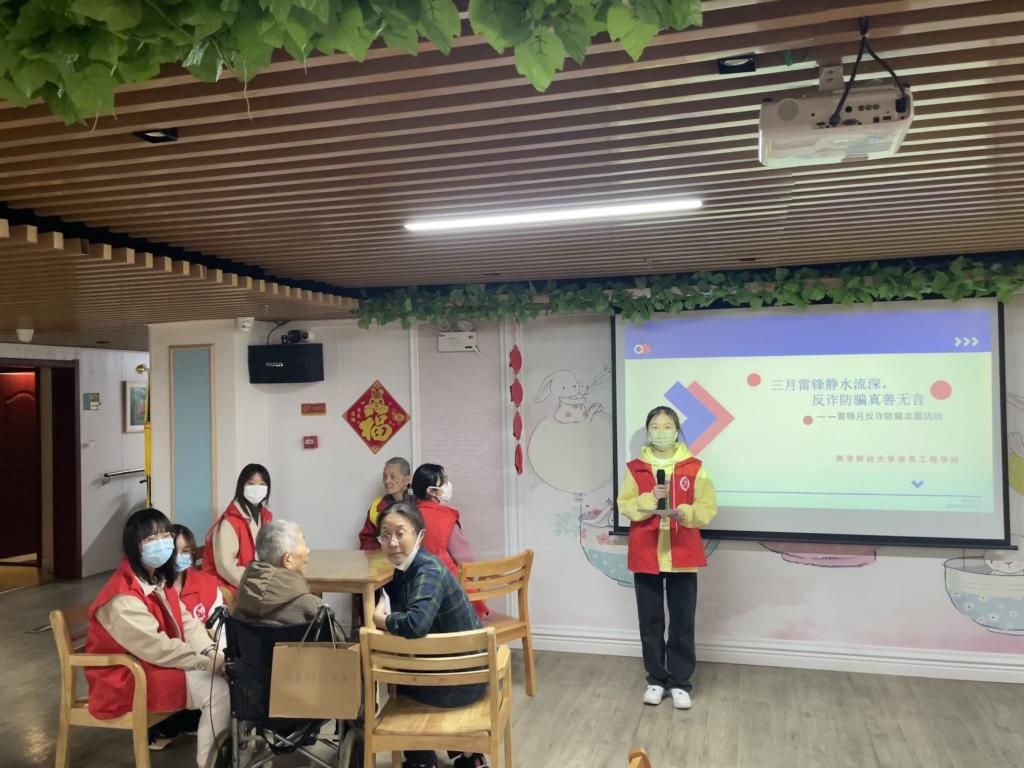 为了给老年人介绍社会上存在的养老诈骗现象,增强老年人的识骗防骗意识,同时更好的引导大学生理解志愿服务精神,广泛普及“学习雷锋,奉献他人,提升自己”的志愿服务理念,3月26日,信息工程学院组织志愿者前往南京市鼓楼区爱馨养老疗养院,开展了以“关爱老人,谨防诈骗,学习雷锋暖人心”为主题的志愿服务活动。