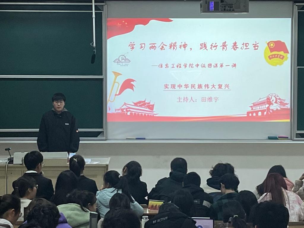 全国两会,是党的二十大之后召开的第一次“春天的盛会”,也是部署全面建设社会主义现代化强国新征程开局起步的一次总动员、总部署。为深入学习贯彻全国两会精神,引导广大团员青年不断坚定“四个自信”、提振发展信心,激情满怀地紧跟党走在中国式现代化道路上,3月23日晚,信息工程学院在博观楼202教室举办“学习两会精神,践行青春担当”中级团课第一讲活动。2022级同学及第十六期青马班全体学员参加。