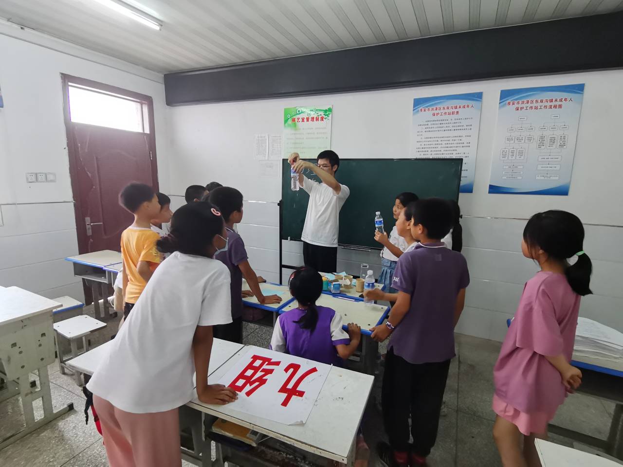志愿者黄泽坤准备好塑料瓶,一次性纸杯等课堂所需要的实验用具,在课堂上,以物理为开端,用各种小实验说明大气压的存在及力量。最后以水底火山实验收尾,上课过程中孩子们都围绕在老师身边,“眼睛不敢离开一秒,深怕错过了重点”。