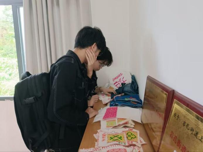 首先,在上山村村委会,绣娘马学珍拿出自绣的苗绣布料摆在桌上供实践队员观察。过程中队员们了解到,这布料是苗服的组成部分——在面料上绣上想要的花纹,将绣好的部分缝制起来,最后制成成衣。交流中,有队员问道“苗族服饰都需要制作哪些部件”,马女士拿出手机,摆出苗服成衣的图片,解释布料与成衣部位的对应。“这个是裙子的花纹,这个是裙腰的花纹,这个是披肩的花纹……”马女士拿着披肩的部分披在肩上给队员们展示。裁剪得当的尺寸,独具创意的花纹让队员们眼前一亮。