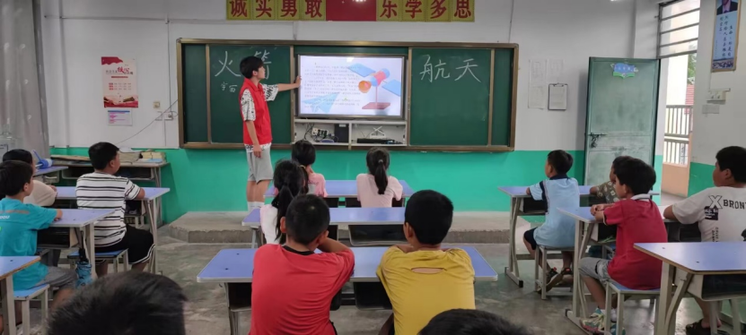 展望航天梦,碰思维火花。支教团队开展了火箭航天课,采取寓教于乐的教学方式,在普及航天物理知识的同时,让孩子们积极发挥想象力,来制作自己的专属火箭。课堂上,孩子们踊跃发言,“反重力火箭”、“战斗机式火箭”……思维的火花在小小的教室中碰撞着,也定将于未来绽放在这片大地之上。课程的最后,支教团队带领孩子们一起制作“水火箭”。制作过程中,孩子们集思广益,齐心协力克服难题,创造出了属于他们的“水火箭”。