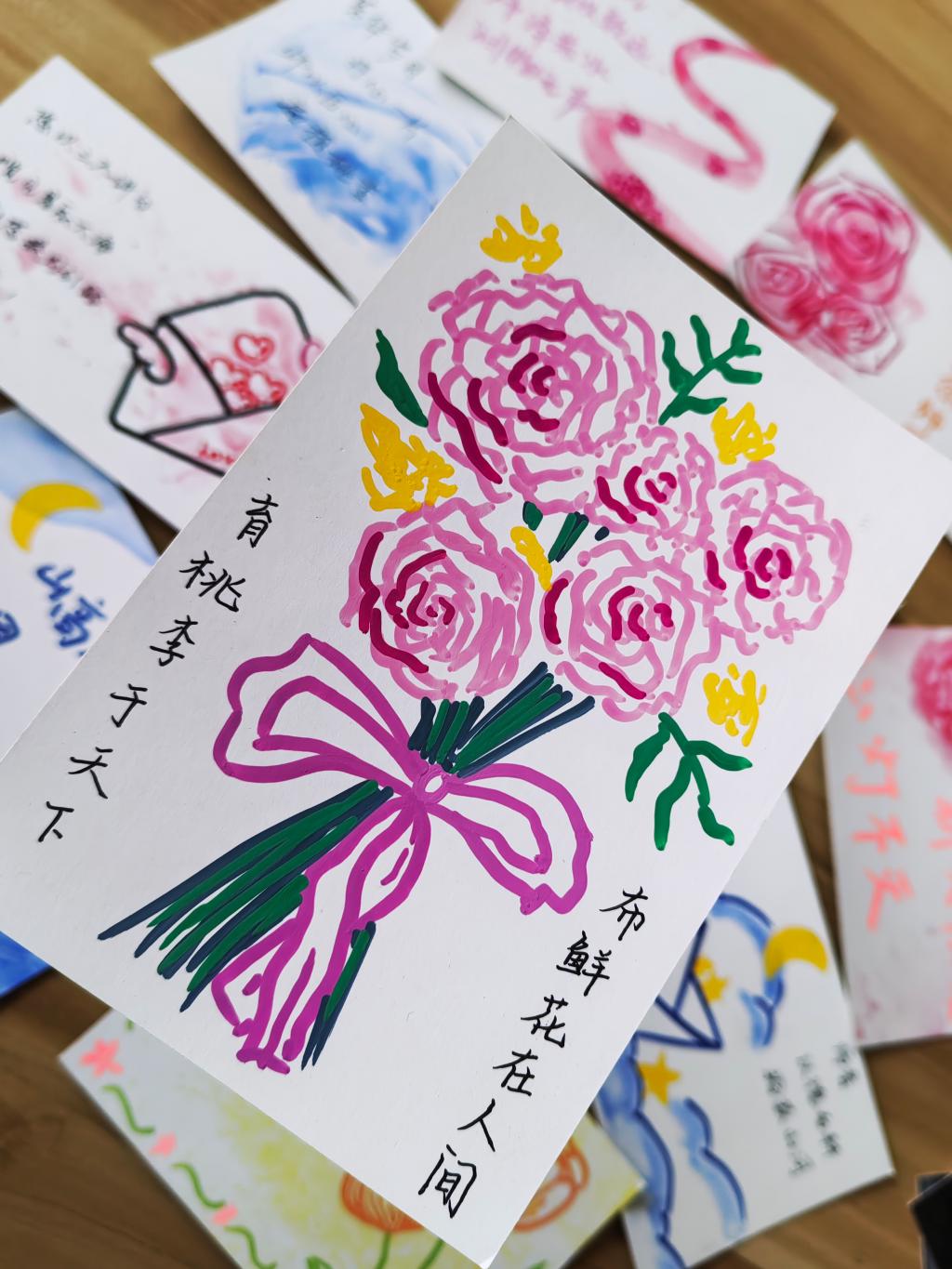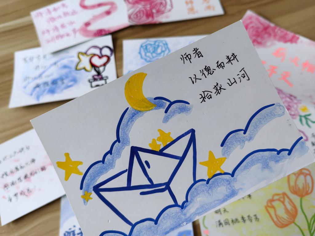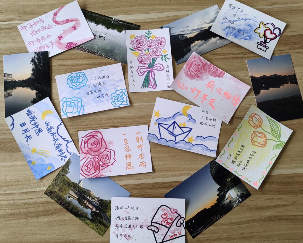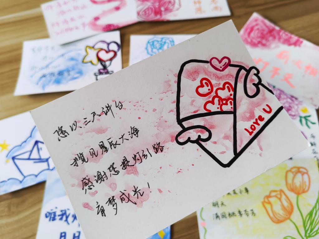 志愿者们用心绘制每一张明信片,每一句祝福,希望能够将自己的感激和祝福通过文字与绘画传递给老师们。老师,您是我人生路上的指南针,感谢您的教导和陪伴。”“亲爱的老师,您的辛勤付出无法言表,希望您健康快乐,永远年轻!志愿者们将自己的明信片交到老师手中,表达自己最真挚的情感。