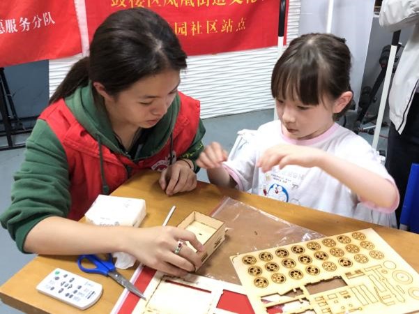 宣讲结束后,在志愿者们的协助下,社区儿童开始为宇航员石膏娃娃进行涂鸦,并借助志愿者们提前准备的模型开始了“玉兔”月球巡视车的创作。志愿者和孩子们打成一片,细心的为孩子们讲解每一步的细节与注意事项。