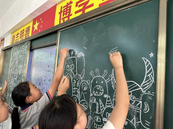 绘画课与手工课“齐头并进”。教室里“空空荡荡”,学生们纷纷来到操场,在篮球的拍打声、树叶的摇动声中,沉浸于周遭环境,任由思绪徜徉,带动笔尖在纸面上延续对美的感知。不久,一棵树,两个小人,几片叶子……生动的图像缓缓铺展开来,无声讲述本次课堂的主题“我的校园趣事”。手工课上,学生们睁大眼睛,视线紧跟着志愿者的拆解动作,手指也伴随着志愿者的讲解,灵活地翻折拉拽、按压、轻拂,将童心与期许折进最终成型的栩栩如生的“龙”中,寄语龙年剩余时光中值得展望的每一天。
