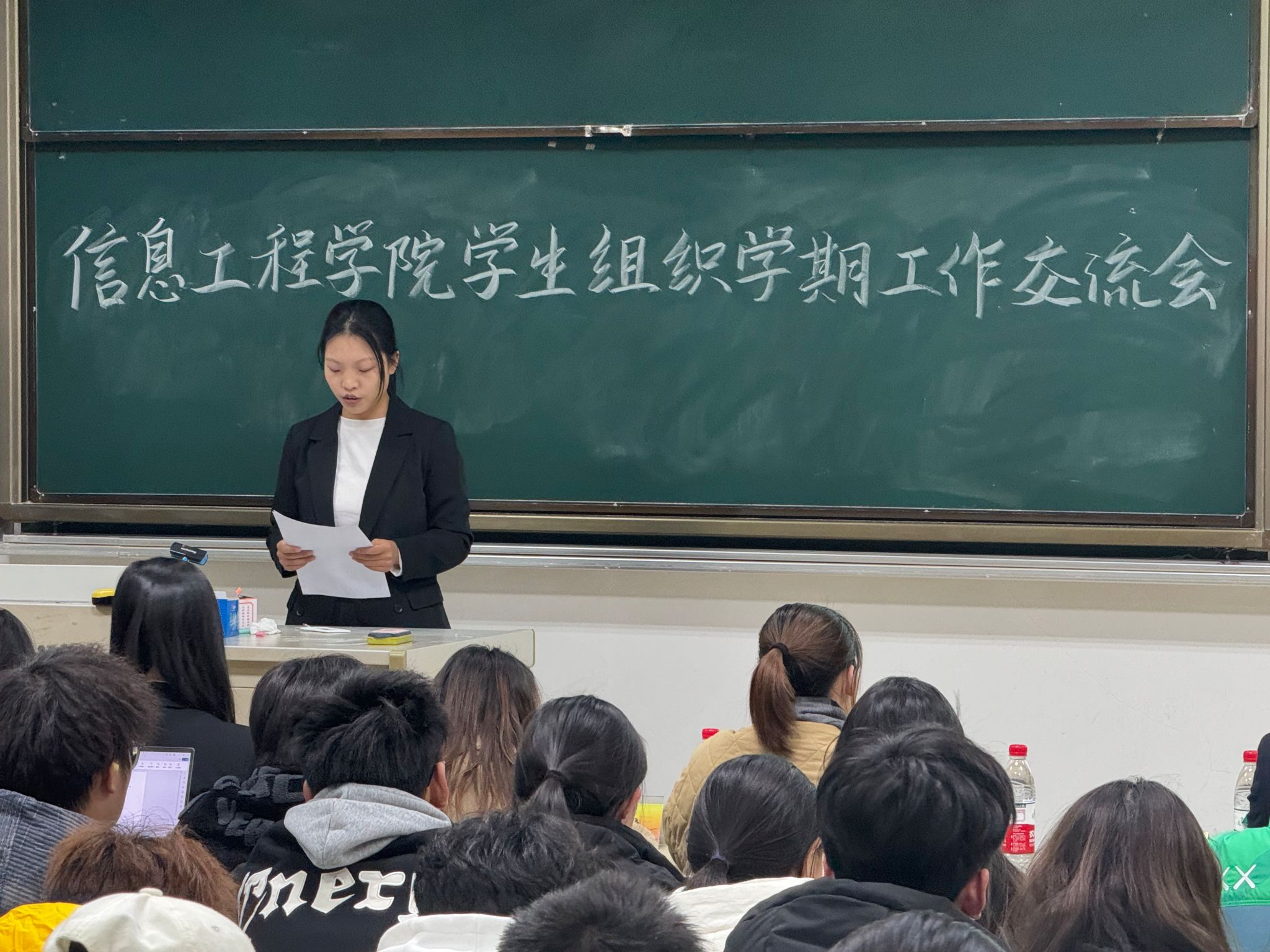 会议伊始,南京财经大学信息工程学院分团委副书记(学生)李晓寒、学生会代表肖逸玲分别进行工作汇报。他们回顾了本学期举办的活动历程,肯定了各位负责人、部长以及志愿者的辛勤付出,鼓励大家不忘初心,砥砺前行。接着,他们指出了学生工作中存在的问题,并提出了切实可行的建议,希望各部门在新的一年里能有更好的表现,为信息工程学院的基础建设贡献力量!