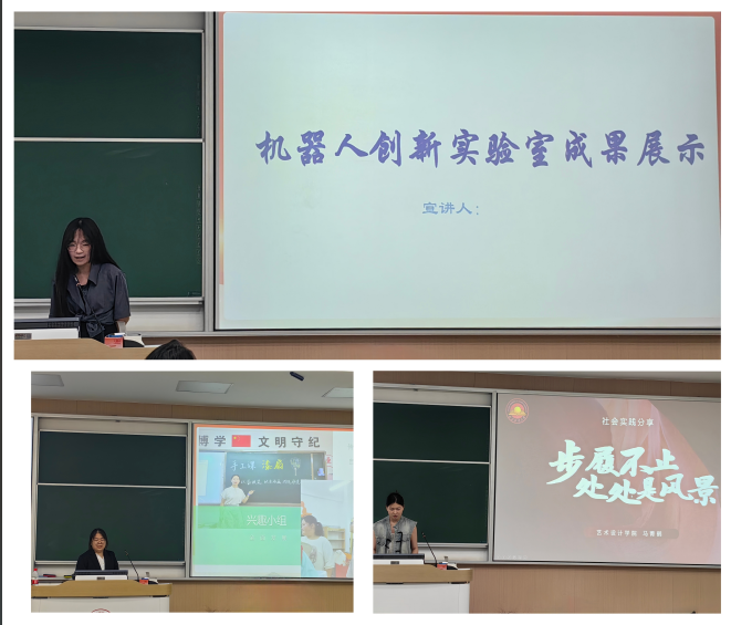 邀请了三组优秀团队——机器人创新实验室、“豫你偕行,烛光辉映”支教团队以及皖南古村探索实践队,为大家分享实践经验。机器人创新实验室蒯乐平分享了他们在暑期社会实践中的创新成果和技术挑战。通过图片和视频,向同学们展示了极具学院特色的实践成果。“豫你偕行,烛光辉映”支教团队队长薛怡宁简单介绍了整个项目的基本情况,重点分享了支教过程中丰富多彩的课程活动内容,并鼓励同学们积极投身暑期社会实践的支教活动,为乡村振兴贡献青年力量。皖南古村探索实践队马菁鹤同学先向同学们展示了他们团队取得的突出的实践成果,然后从前期准备、中期纪实、后期总结三个方面向同学们介绍了他们在暑期社会实践过程中的主要工作,激发了同学们深入基层实践的热情。