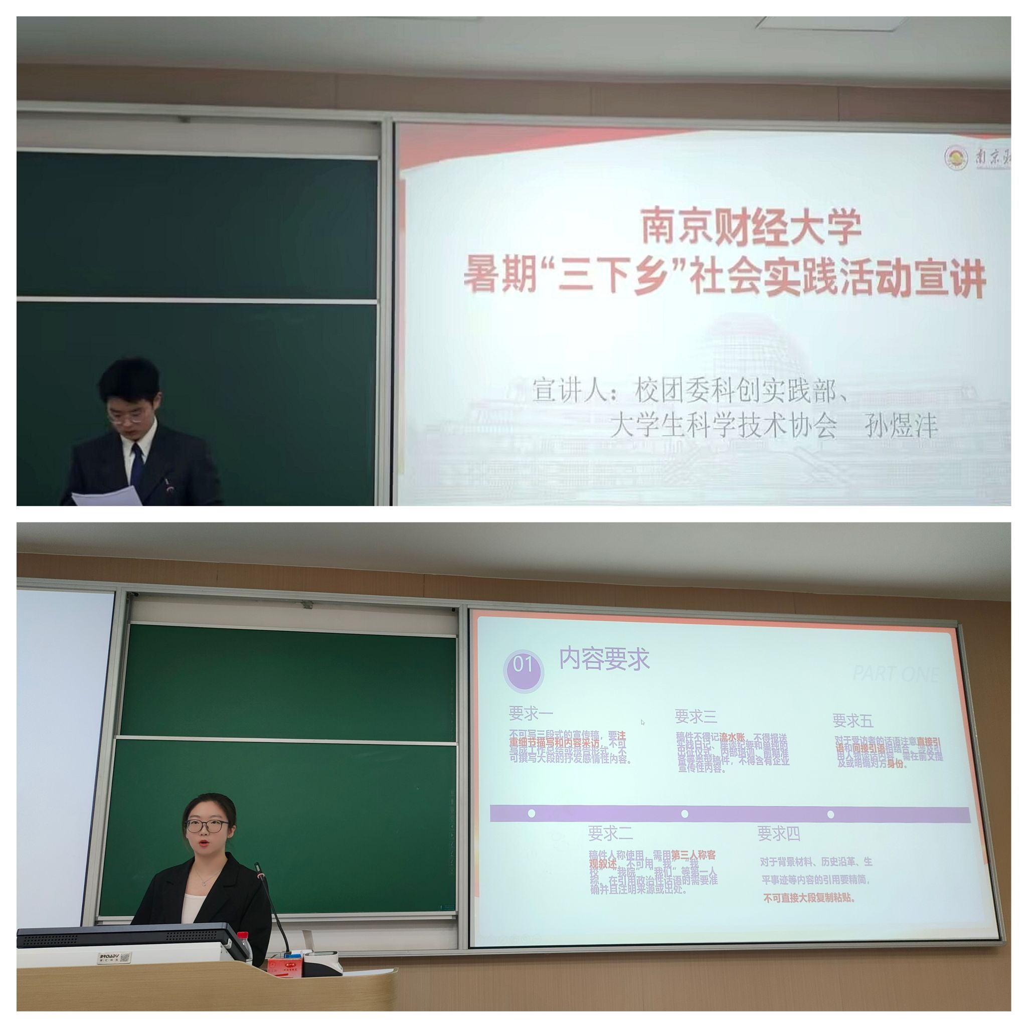 紧接着,校团委科创实践部、大学生科学技术协会孙煜沣从政策聚焦、通知解读、时间流程三个方面向同学们展开介绍,和同学们强调了重要的时间节点和活动环节。校青年媒体中心编辑审核部王青则详细介绍了投稿要求及流程。投稿要求方面,明确了新闻稿投稿内容和格式、组图稿、视频稿的图片与视频等具体要求。投稿流程方面,重点强调了中青网的投稿流程,帮助同学们对外宣平台的投稿流程有了进一步的认识。