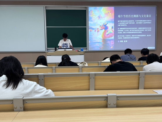 在成果汇报中,各小组代表通过PPT展示、情景演绎、互动问答等多元形式呈现研讨成果。其中第三小组以“端午符号的现代转译”为题,对比 “龙舟竞渡→体育竞技”“五彩绳→时尚饰品”等案例,阐释传统习俗的创新路径;第九小组则以“全球化传播中的文化自信”为主题,播放自制的多语种端午文化短视频,展现跨文化传播的可行性。