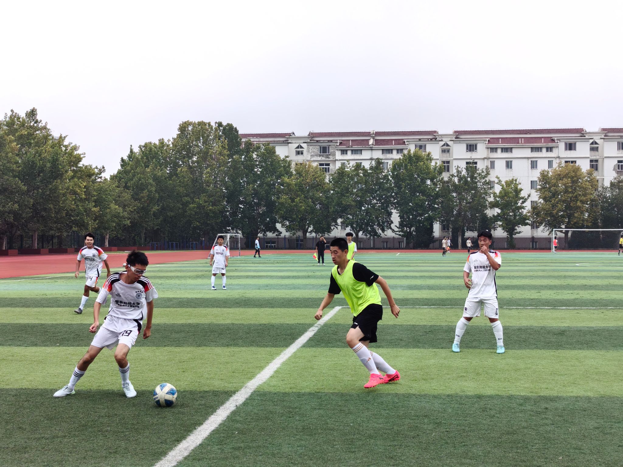 在湿滑的场地上,双方你来我往,互有攻守,比分交替上升,战况一度陷入胶着。雨水与汗水浸湿了队员们的白色战袍,却丝毫未减他们眼中对胜利的渴望。每一次拼抢、每一次解围、每一次射门都紧紧牵动着场边观众的心弦。最终,计算机与人工智能学院的队员们顶住压力,凭借更胜一筹的韧性和关键时刻的把握能力,以5:4的比分惊险取胜。当终场哨声吹响,比分定格,胜利的荣光,成为了坚韧与拼搏的最好注脚。