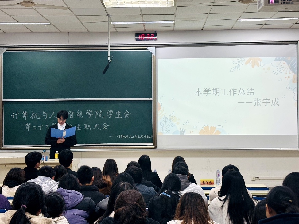 学生会主席张宇成就本学期工作进行总结汇报,在回顾了学期的活动历程后,对学生会成员的辛勤付出表示肯定,接着就其中存在的问题进行梳理与建议,殷切希望学生会继续为学院建设而砥砺前行。
