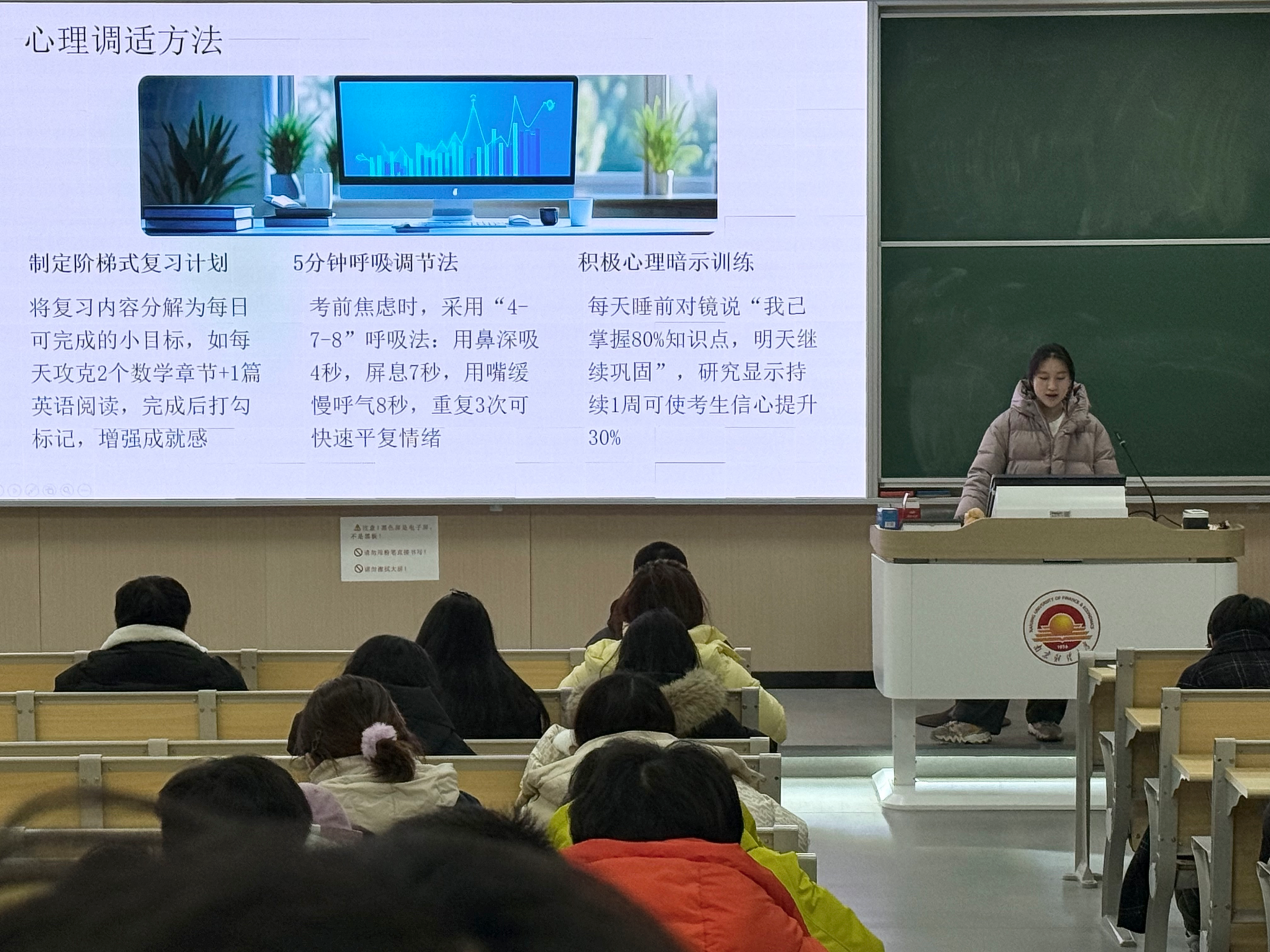 于博观楼201教室开展了“静心迎考,安心假期”主题活动。本次活动涵盖期末考前心理调适专题分享与寒假安全教育宣讲会两大板块,吸引了众多学生踊跃报名、积极参与。