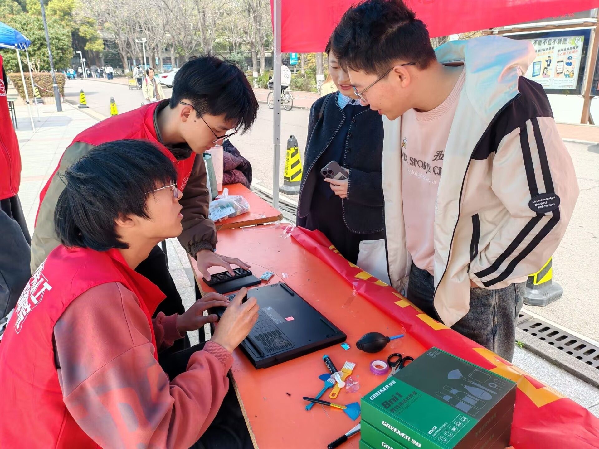为确保志愿服务质量,志愿者们在活动前专门开展了专业实操培训,熟练掌握系统优化、硬件维护等技能,以“耐心、细心、用心”的服务态度,一对一为师生排忧解难。服务过程中,他们不仅埋头专注拆解、清灰、调试,还主动化身“科普宣传员”,向师生细致科普日常电脑保养技巧,讲解系统优化与硬件维护的实用知识,手把手指导大家如何规避常见用机问题,让师生们在解决当下设备难题的同时,学会更好地爱护自己的电子设备,实现 “授人以鱼” 与 “授人以渔” 的双重成效。阳光下,红马甲的身影忙碌穿梭,汗水浸湿衣背却依然笑容满面;师生们满意的笑容与一声声真诚的感谢,让整个义诊现场暖意融融,成为校园里一道践行雷锋精神的亮丽风景线。