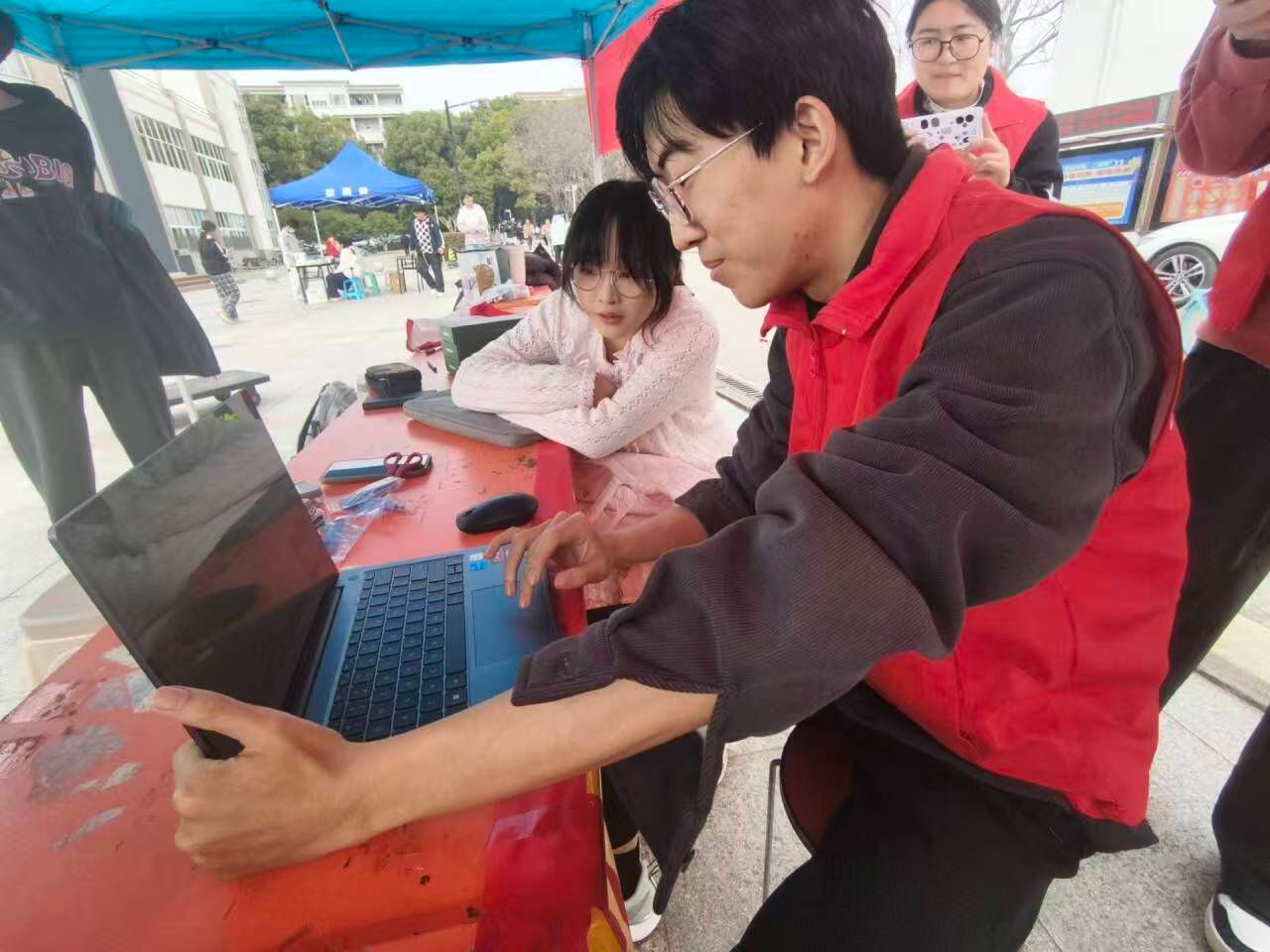 在中苑食堂门口开展“电脑义诊”学雷锋志愿活动。身着红马甲的志愿者们化身“设备医师”,以专业技术为笔、以暖心服务为墨,用实际行动传承雷锋助人为乐的优良作风,为师生的电子设备“把脉问诊”,让志愿服务的温暖在校园里悄然传递。