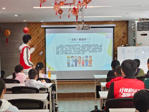 “小朋友们,你们知道为什么五一要放假吗?”活动伊始,志愿者主持人用亲切的提问抓住孩子们的注意力。屏幕上闪过工人游行的历史画面,配合简单易懂的讲述,劳动节的由来在孩子们心中渐渐清晰。“劳动节就是感谢所有辛苦工作的人的节日!”一个男孩抢答道。当主持人问起“身边的劳动者有哪些”时,小手如春笋般举起——“警察叔叔!”“外卖员阿姨!”“还有每天扫地的环卫工爷爷!”每说出一个职业,志愿者便送上一枚小贴纸。掌声与欢笑声中,孩子们第一次意识到:原来每一份平凡的劳动,都值得被尊重。