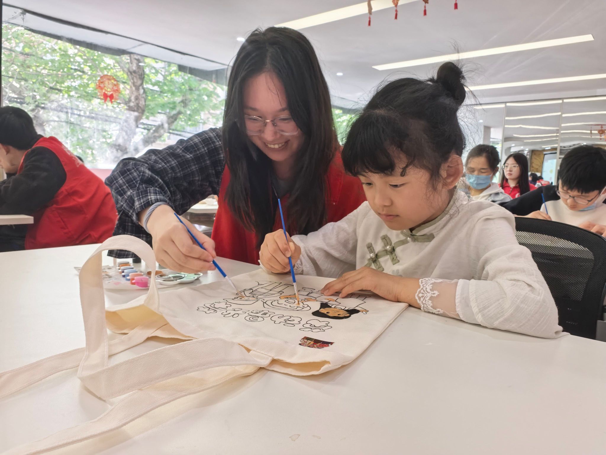 志愿者和小朋友一起在帆布袋上进行手工创作