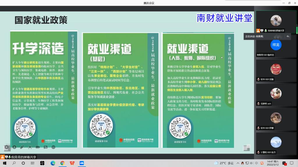 倪青青老师首先带领大家分析了2022年的就业形势,使学生明了就业形势的严峻性,切记不要等待观望。然后,倪老师又给同学们详细介绍近期学校和社会上相关的大学生春季招聘信息,鼓励学生积极关注就业措施以及招聘信息。随后,倪老师就毕业生如何制作简历、精准投递简历,如何调整就业心态,主动寻找适合自己的工作上进行指导。最后,倪老师向毕业生就中央及各地政府为促进就业出台的相关政策进行宣传和解读,让毕业生了解并掌握基层就业、应征入伍等相关政策和优势,熟知国家就业政策以稳固毕业生就业的信心,激发其就业决心,引导学生到基层、到西部、到祖国最需要的地方建功立业。